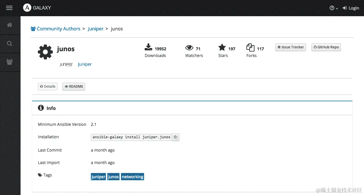 Ansible Galaxy (docs.ansible.com/ansible/latest/reference_appendices/galaxy.html)是一个免费的社区网站,用于查找、共享和协作角色。您可以在 Ansible Galaxy 上查看由 Juniper 网络提供的 Ansible 角色的示例: