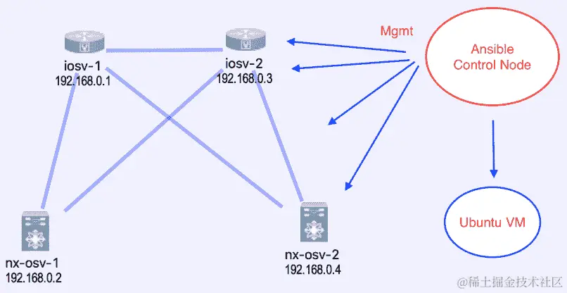 在本章和第五章中,我们的实验室将有一个安装了 Ansible 的 Ubuntu 16.04 控制节点机器。这个控制机器将能够访问我们的 VIRL 设备的管理网络,这些设备包括 IOSv 和 NX-OSv 设备。当目标机器是主机时,我们还将有一个单独的 Ubuntu 虚拟机用于我们的 playbook 示例。