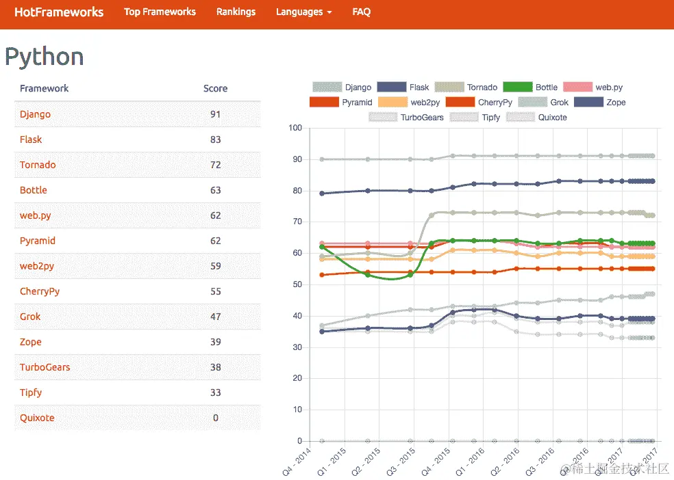 当然,我对编程语言(Python!)和 web 框架(Flask!)有自己的偏见。在这一部分,我希望向你传达我选择一个而不是另一个的理由。让我们选择前面 HotFrameworks 列表中的前两个框架并进行比较: