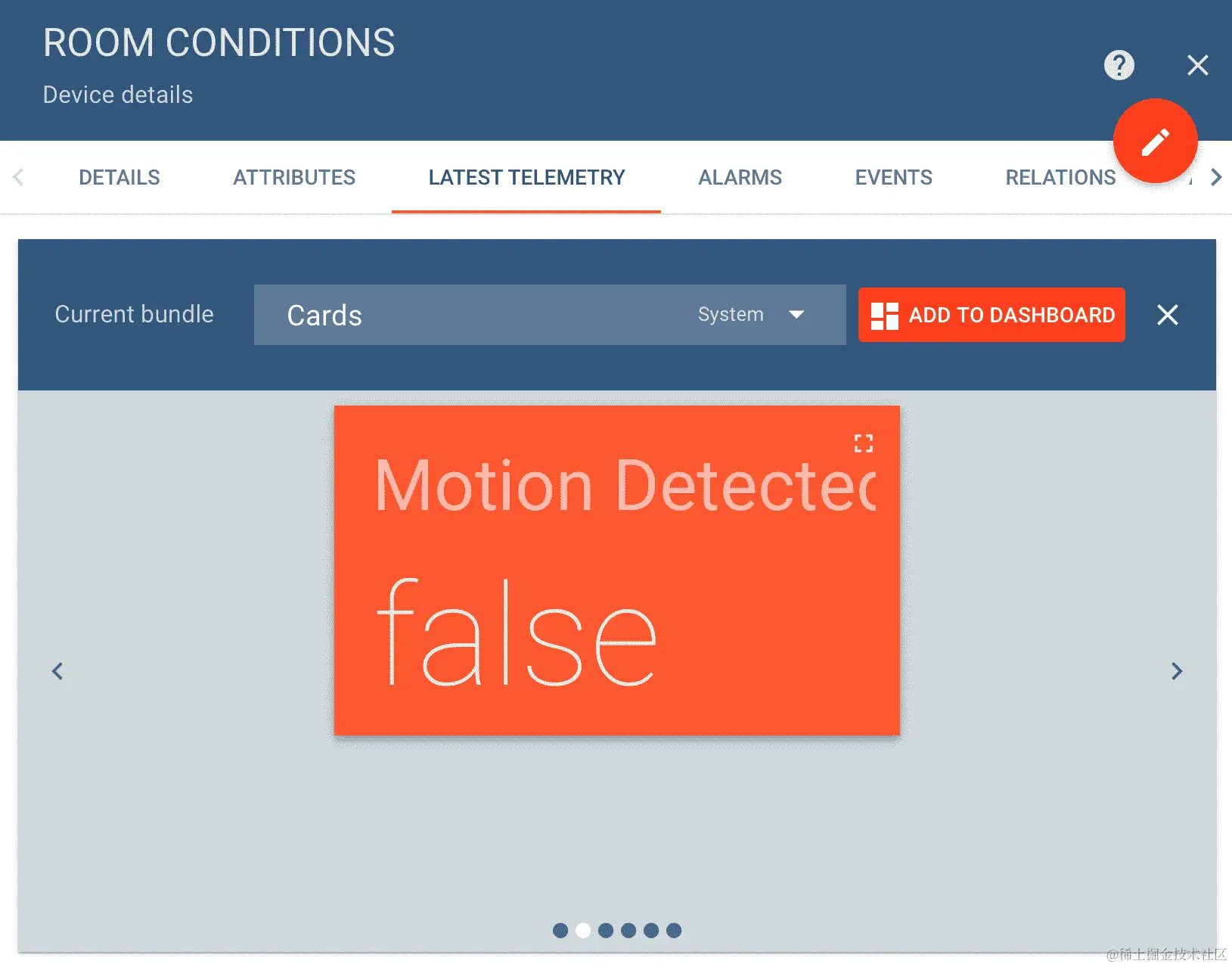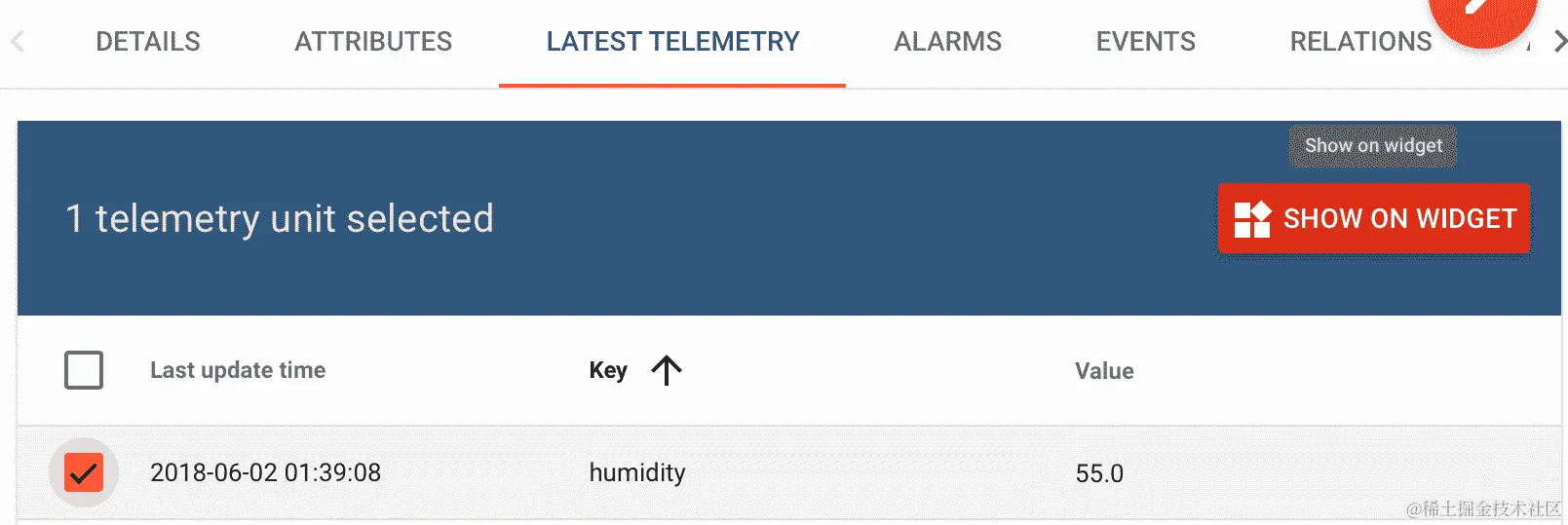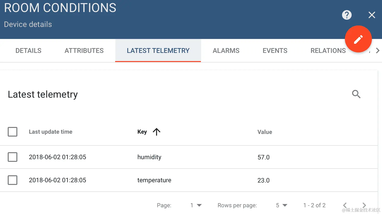 - 返回 ThingsBoard,单击“设备”,然后单击“ROOM CONDITIONS”。侧边菜单应该从右侧滑出: