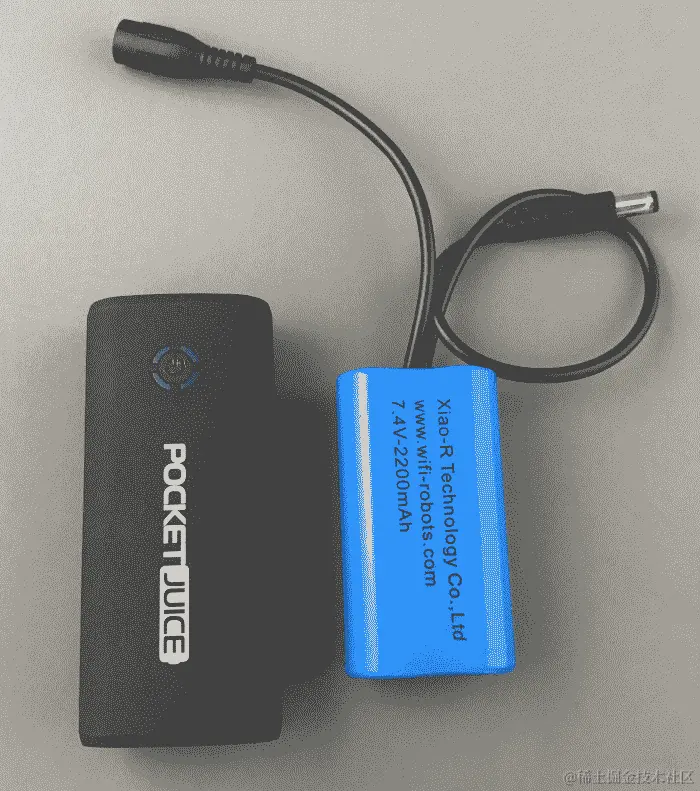 - 以下是我们将用于我们的机器人车的两个电池。左边的是用于树莓派的,使用 USB 到 Micro-USB 连接器。右边的是电机驱动板,使用标准的 DC 插头: