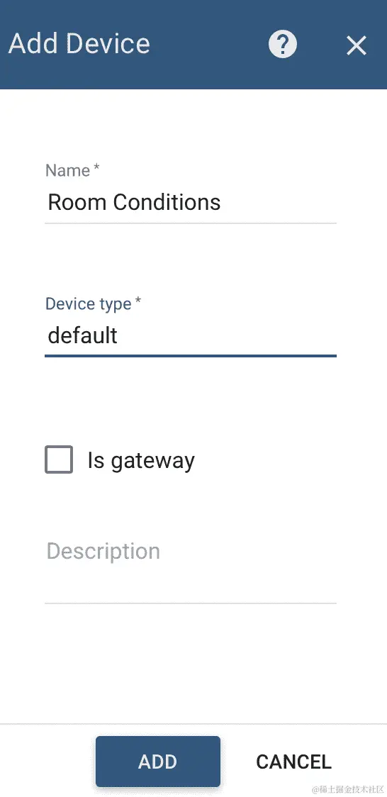 Room Conditions作为名称*,并选择默认作为设备类型*。不要选择 Is gateway。点击 ADD: