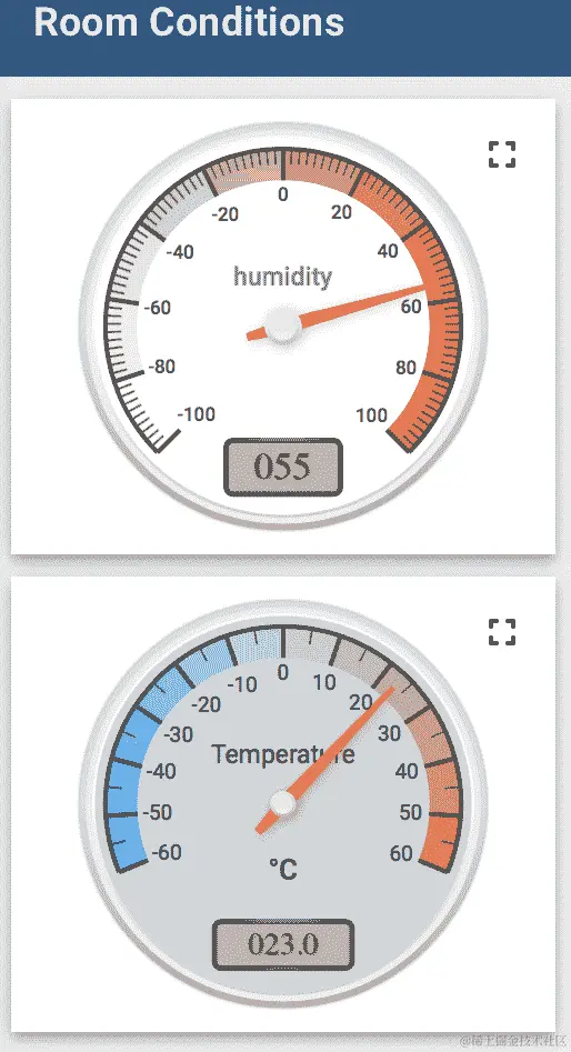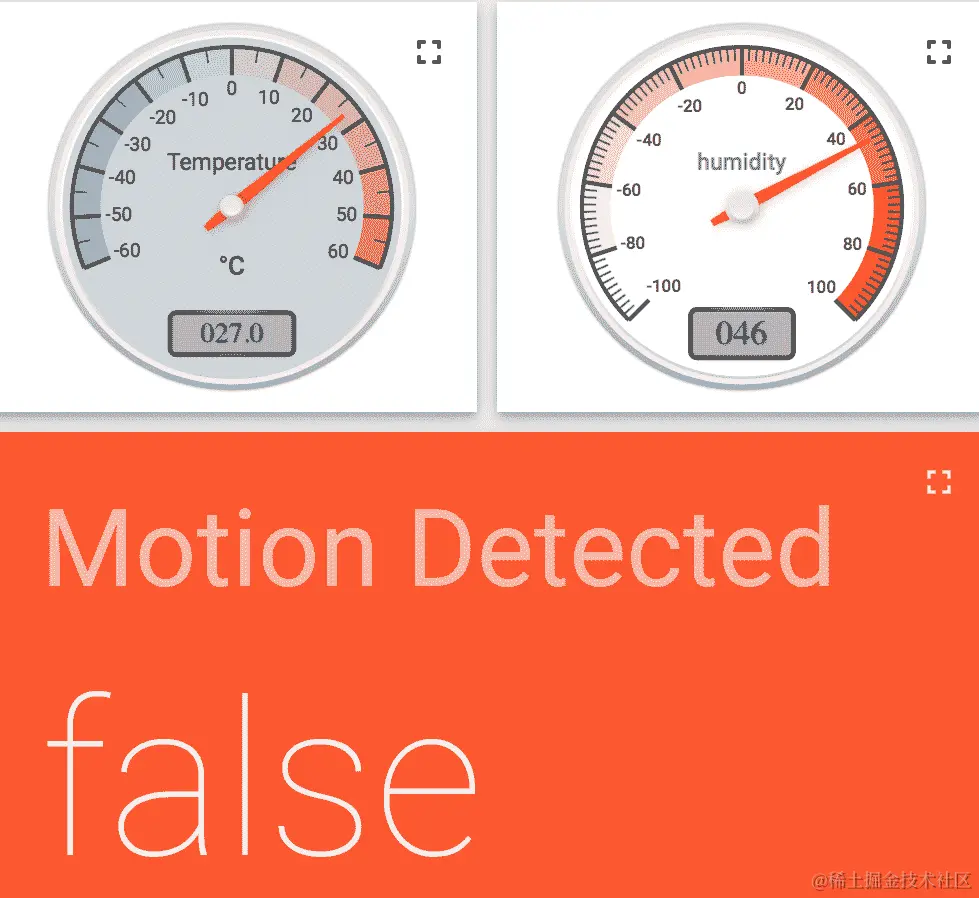 现在,您应该看到一个仪表板,其中显示了湿度和温度值,显示在模拟表盘上。