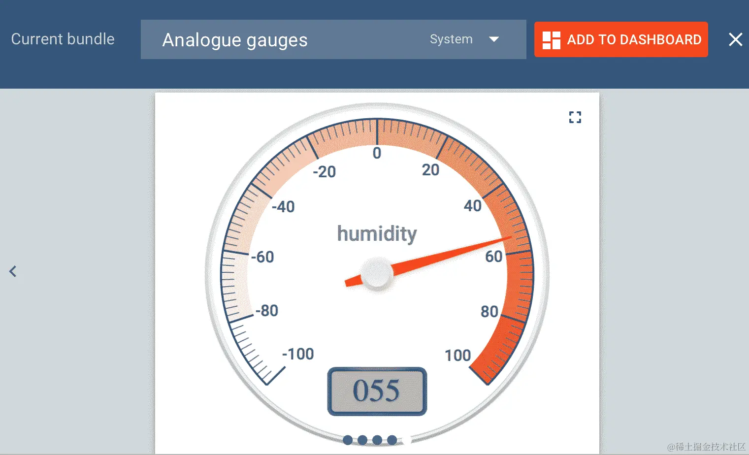 - 选择当前捆绑到模拟表盘,并循环浏览表盘,直到找到湿度表盘小部件。单击“添加到仪表板”按钮: