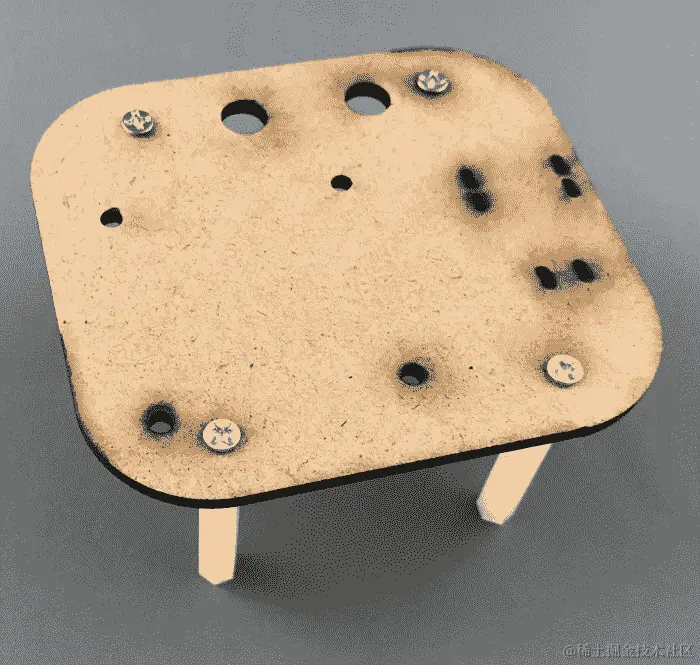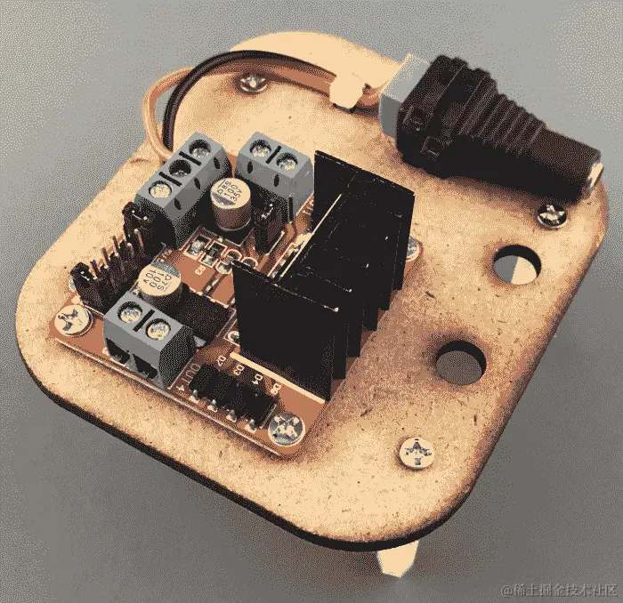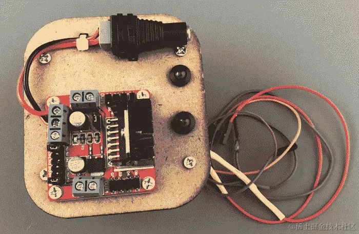 - 首先,使用四颗 M3 10 毫米螺栓将第 5 步中的直流电机板组件固定在底盘顶部。确保将轮子电机的电线穿过中央孔。尾灯 LED 应该安装在机器人车的后部。参考以下照片以便澄清:
