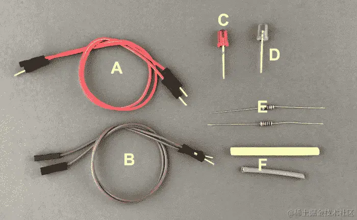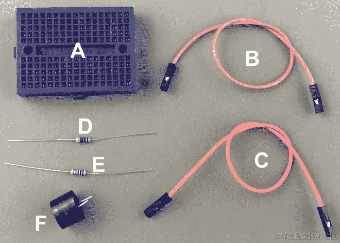 - 为了创建电压分压器,在面包板(A)上将 330 欧姆(E)和 470 欧姆(D)电阻串联: