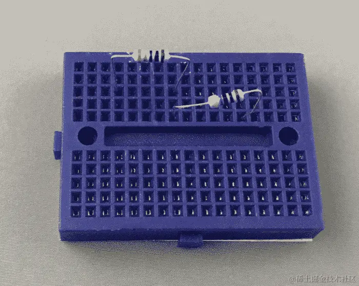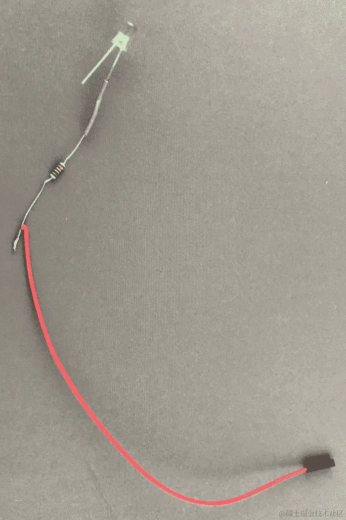 从 HC-SR04 的 GND 到迷你面包板上 470 欧姆电阻的右侧
