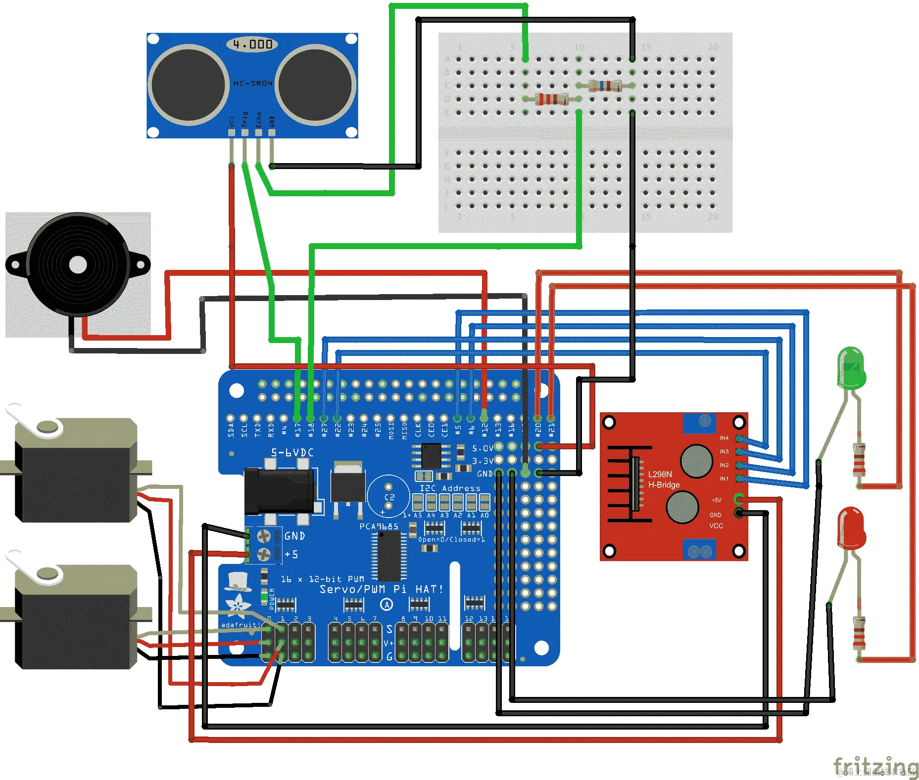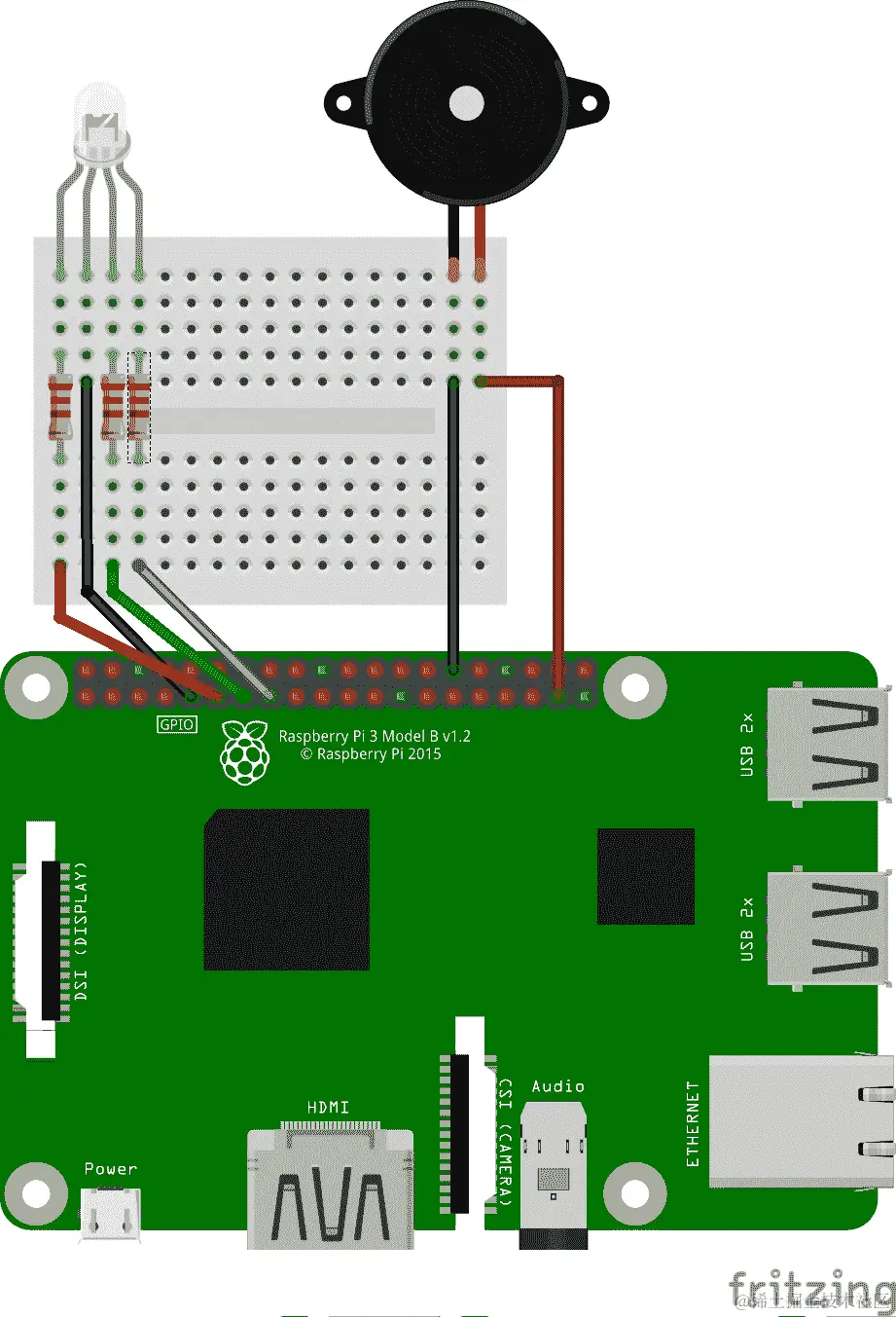 安装在底盘上的最终组件是蜂鸣器和电压分压器。我们需要电压分压器,以便我们可以从距离传感器的回波引脚向树莓派提供 3.3V。对于蜂鸣器,我们使用的是有源蜂鸣器。
