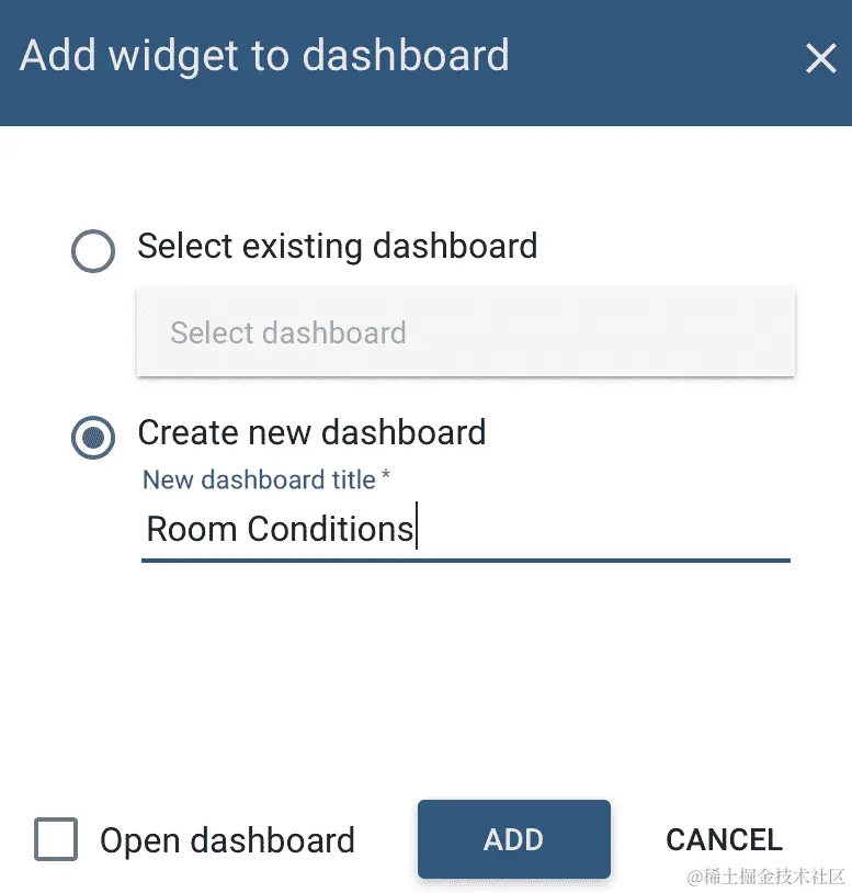 重复上述步骤以添加温度值。选择温度小部件,并将小部件添加到“Room Conditions”仪表板。这次,在单击“添加”之前选择“打开仪表板”: