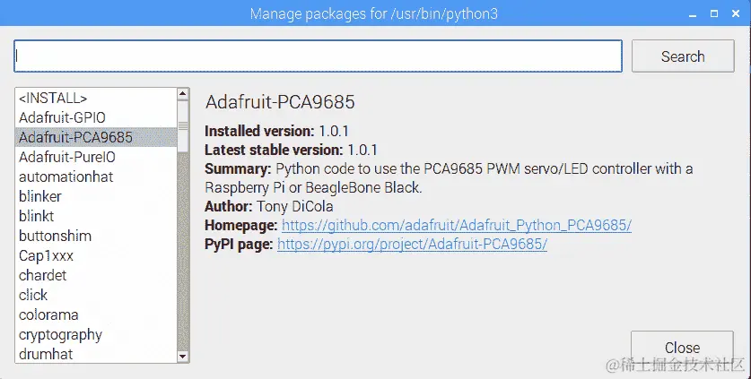 - 库已成功安装到 Thonny 的工具|管理包中。您应该能看到它在列表中: