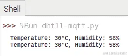 dht11-mqtt.py的新文件。在文件中输入以下内容并运行。确保粘贴从剪贴板中复制的访问令牌: