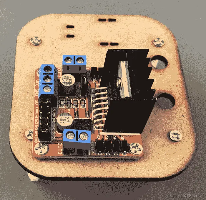 - 将轮子电机的电线安装到电机驱动板的 OUT1、OUT2、OUT3 和 OUT4 端子块中。右侧电线应连接到 OUT1 和 OUT2,左侧电线应连接到 OUT3 和 OUT4。在这一点上,右侧电线连接到 OUT1 或 OUT2(或左侧电线连接到 OUT3 或 OUT4)并不重要。参考以下照片以便澄清: