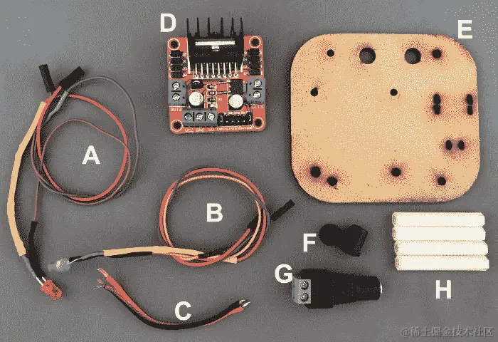 - 使用 30 毫米 M3 螺栓和 M3 螺母,通过使用轮子支架(D)将电机(B)安装到底盘(E)上。确保螺栓的头部平躺。参考以下照片以便澄清: