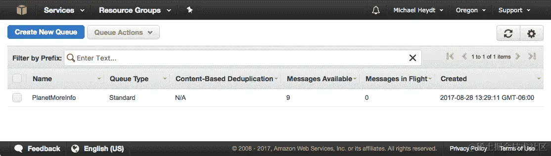 现在进入 AWS SQS 控制台。您应该看到队列已经被创建,并且它包含 9 条消息: