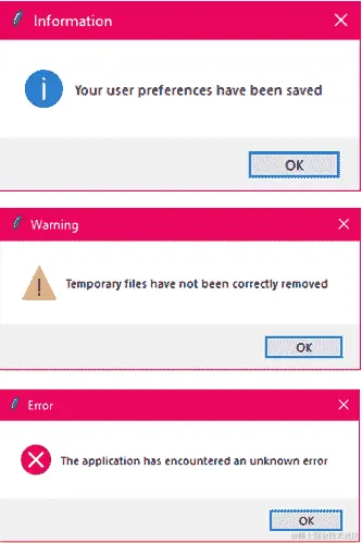 对话框的一个常见用例是通知用户应用程序中发生的事件,例如记录已保存,或者无法打开文件。现在我们将看一下 Tkinter 中包含的一些基本函数来显示信息对话框。