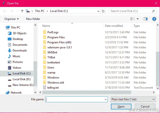 文件对话框允许用户从文件系统中选择一个或多个文件。在 Tkinter 中,这些函数声明在tkinter.filedialog模块中,该模块还包括用于选择目录的对话框。它还允许您自定义新对话框的行为,例如通过其扩展名过滤文件或选择对话框显示的初始目录。