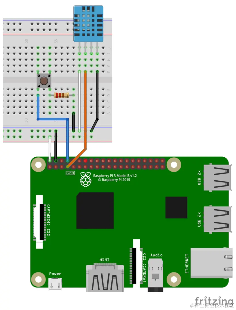 从传感器读取值可能是有用的,但更有用的是能够响应电路中发生的事件并作出相应的行动。为了演示这个过程,我们将在电路中添加一个硬件按钮,并监视它的状态,以便我们可以在按下按钮时进行温度和湿度读数。