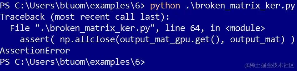 我们进行了一个小的测试案例,并将其与 CUDA 中矩阵乘法的输出进行了检查,对于两个 4 x 4 矩阵,它作为断言检查失败,如下所示: