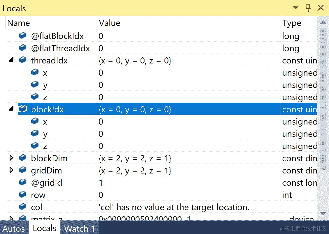 让我们从内核的入口点开始。我们看到两个变量row和col,所以我们应该立即检查这些。让我们在设置它们之后立即放上一行代码(因为这是在两个维度上并行化的,我们应该打印threadIdx和blockIdx的x和y值):