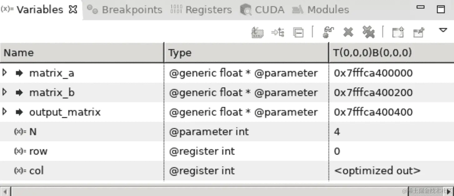 让我们通过一个例子来看看如何使用printf调试 CUDA 内核,然后再继续。这种方法并没有确切的科学依据,但通过经验可以学会这种技能。我们将从一个 CUDA 内核开始,用于矩阵乘法,但其中有几个错误。(鼓励读者随着我们的步骤阅读代码,该代码可在存储库中的6目录中的broken_matrix_ker.py文件中找到。)