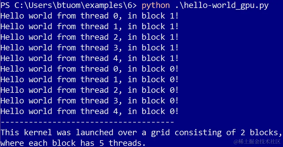 我们现在将提取内核,然后在由两个块组成的网格上启动它,每个块有五个线程: