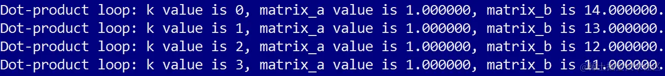 printf("Dot-product loop: k value is %d, matrix_a value is %f, matrix_b is %f.\\n", k, matrix_a[ row + k*N ], matrix_b[ col*N + k]);