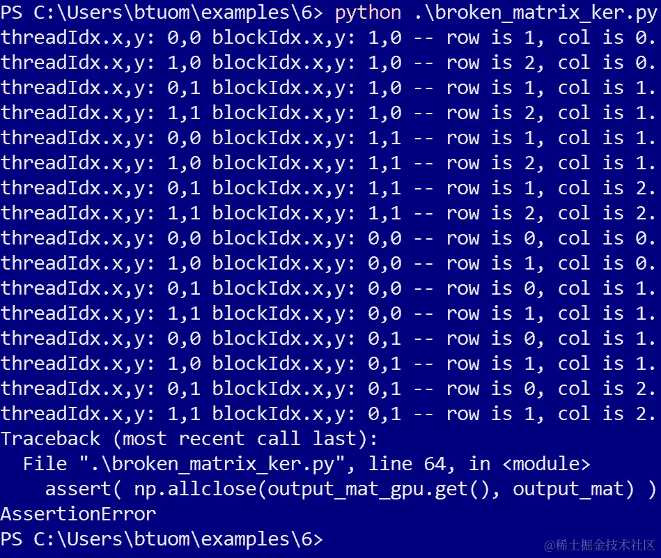 当我们运行程序时,会有更多的行输出,但我们会看到一行说—threadIdx.x,y: 0,0 blockIdx.x,y: 1,0 -- row is 2, col is 0.,还有另一行说—threadIdx.x,y: 0,0 blockIdx.x,y: 1,0 -- row is 0, col is 2, N is 4。通过threadIdx和blockIdx的值,我们看到这是同一个块中的同一个线程,但row和col的值是颠倒的。实际上,当我们查看rowcol_dot设备函数的调用时,我们看到row和col确实是与设备函数声明中的相反。我们修复了这个问题,但当我们再次运行程序时,又出现了另一个断言错误。