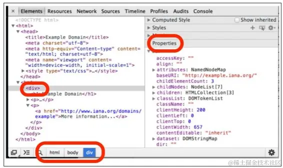 你也可以选择属性。example.com/上唯一的属性是链接 href,可以通过下面的方式找到: