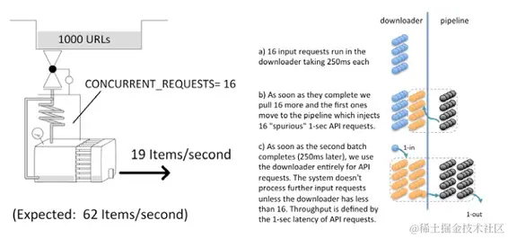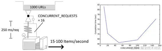 再次运行 crawl easy -s CLOSESPIDER_ITEMCOUNT=1000。因为 pipelines 的平均时间从 0.12 变为 0.15 秒,平均延迟从 0.78 变为 0.81 秒。吞吐量仍保持每秒约 25 项。