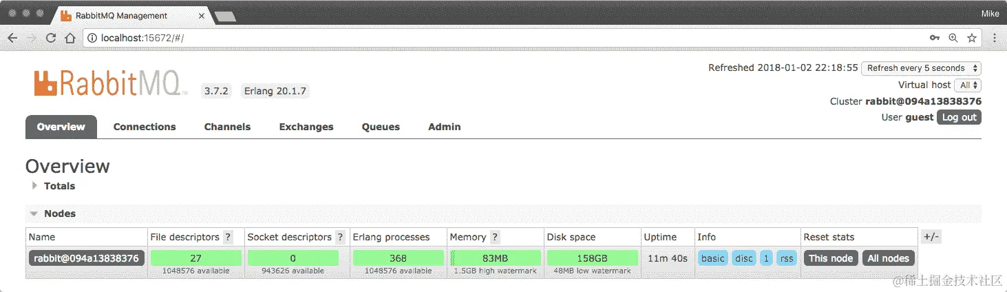 18c2f01f58c7 rabbitmq:3-management "docker-entrypoint..." 3 hours ago Up 3 hours 4369/tcp, 5671/tcp, 0.0.0.0:5672->5672/tcp, 15671/tcp, 25672/tcp, 0.0.0.0:15672->15672/tcp rabbitmq