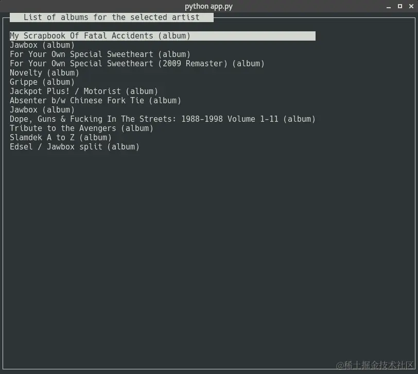 在获取条件后,我们调用get_artist_albums,它将首先搜索艺术家,然后获取艺术家专辑列表并返回MenuItem对象的列表。