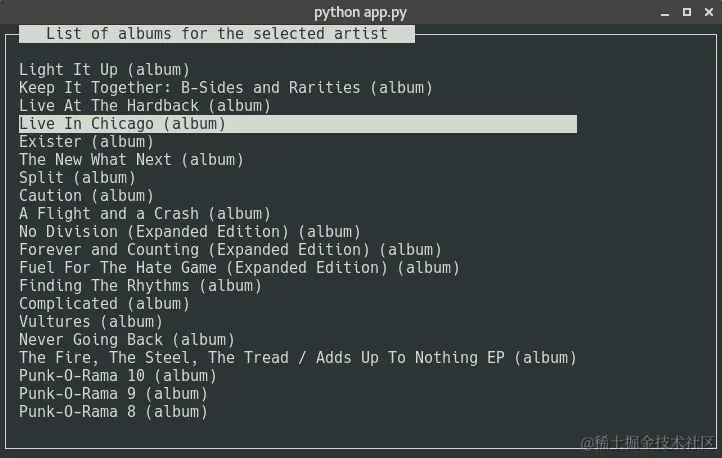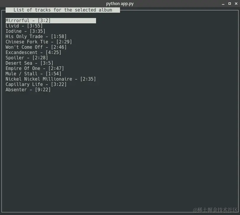 如果当前面板的handle_events方法返回一个可调用的action,我们执行它并获取结果。然后,我们检查活动面板是否是第一个面板(带有专辑)。在这种情况下,我们需要获取所选专辑的曲目列表,因此我们在DataManager实例中调用get_album_tracklist。