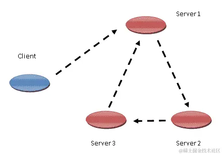 客户端向服务器 1发出请求,然后将请求转发到服务器 2,然后调用服务器 3。当服务器 3调用服务器 1时,链式调用结束。