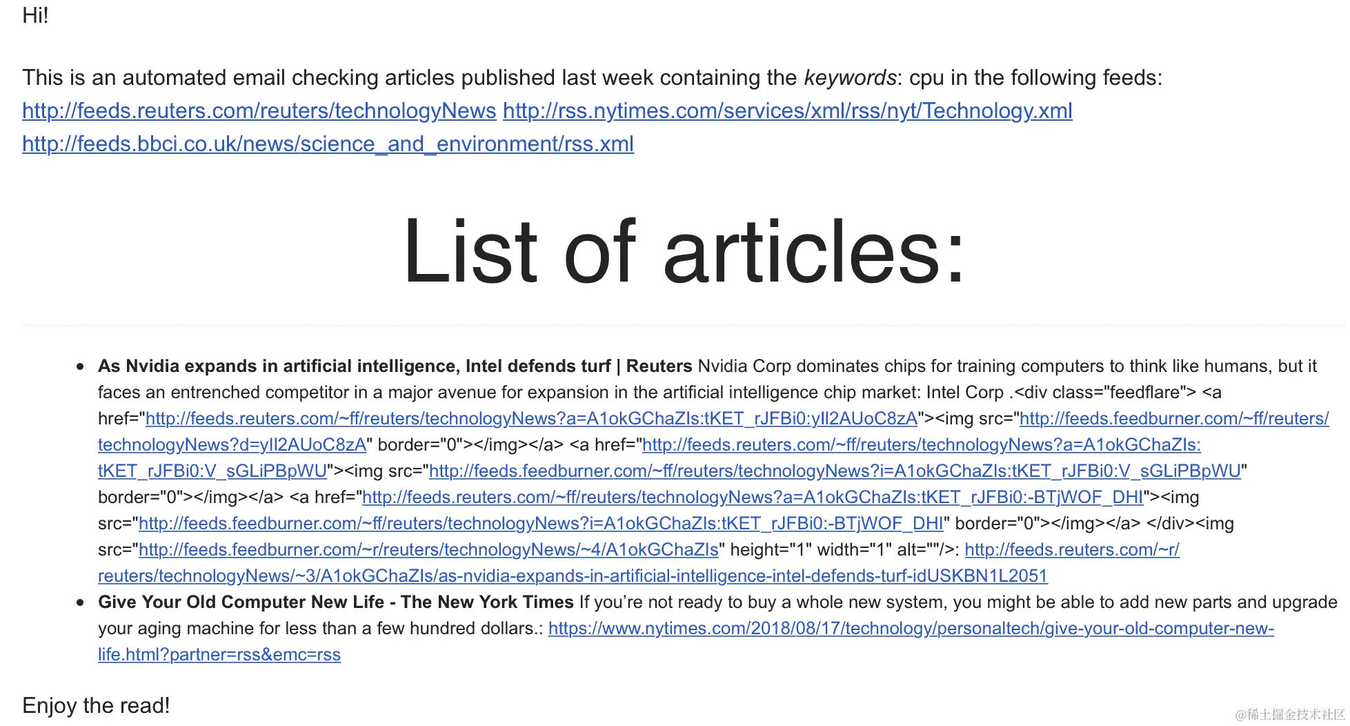 例如,在我们的示例中,你可以看到路透社的摘要包含 HTML 信息,这些信息在最终的电子邮件中被渲染。如果你遇到这种问题,你可能需要进一步处理返回的数据,直到它变得一致。这可能高度依赖于预期的报告质量。