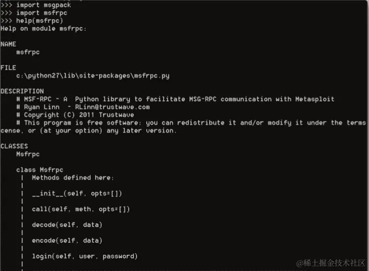 安装完成后,我们可以在脚本中导入模块并与MsfRpcClient类建立连接: