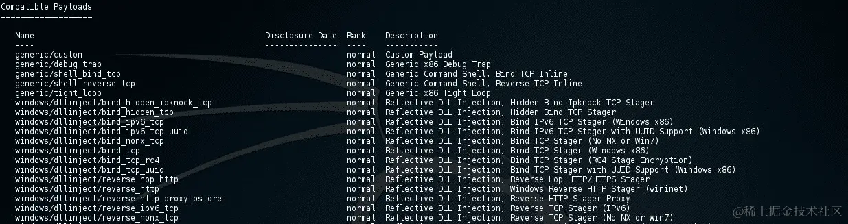 就像 Metasploit 控制台一样,您可以检索所有可用的模块编码器、有效载荷和 exploits 的列表:
