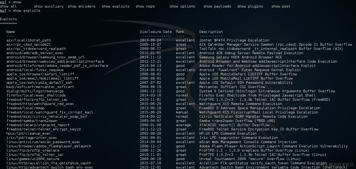 我们如何可以获得 Metasploit 服务器上所有 exploits 的列表?