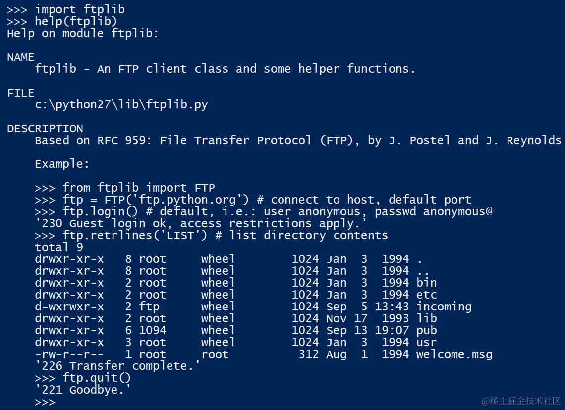 在此屏幕截图中,我们可以看到在ftplib模块上执行help命令: