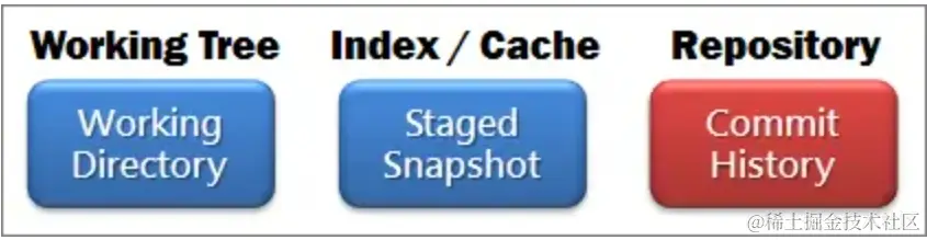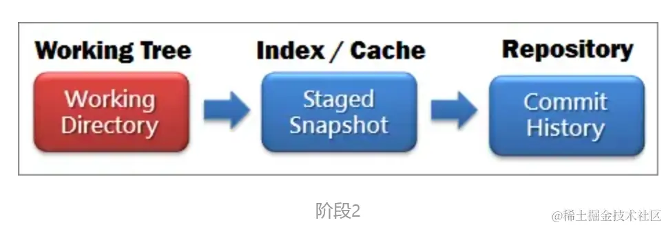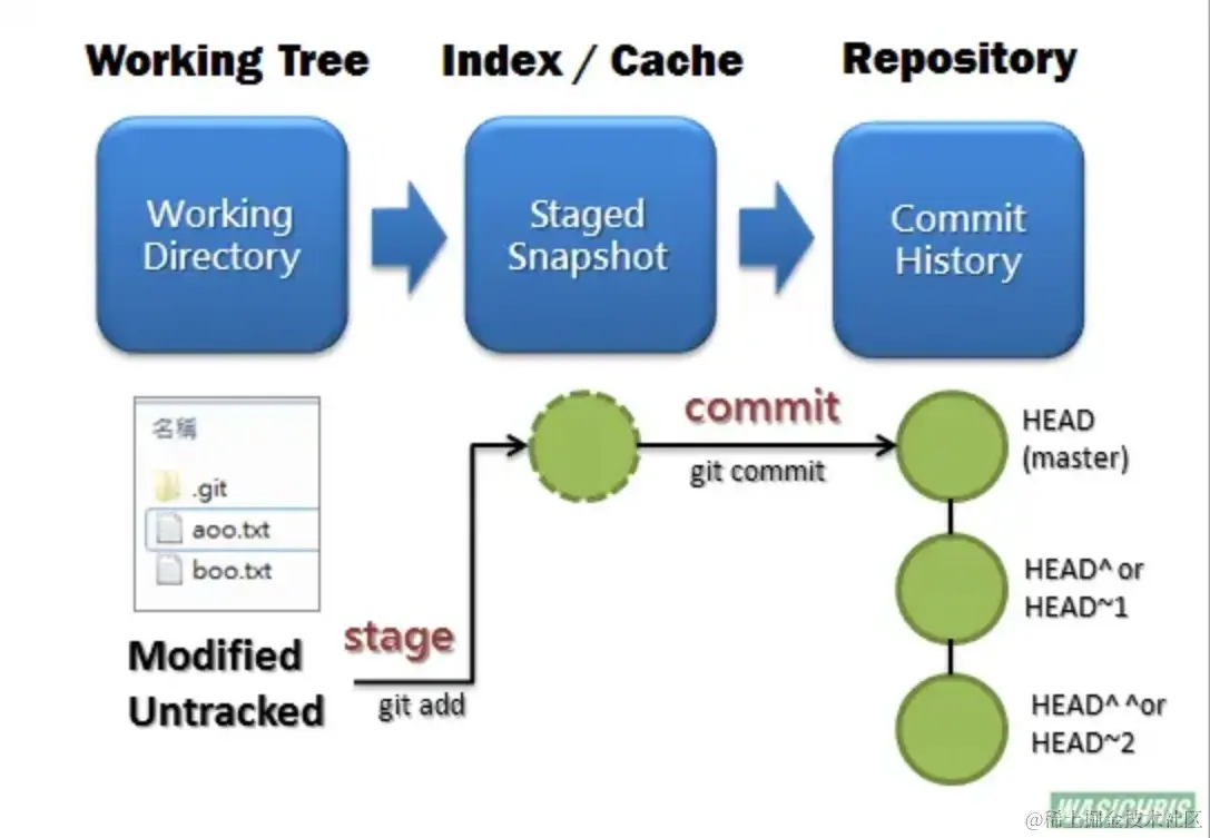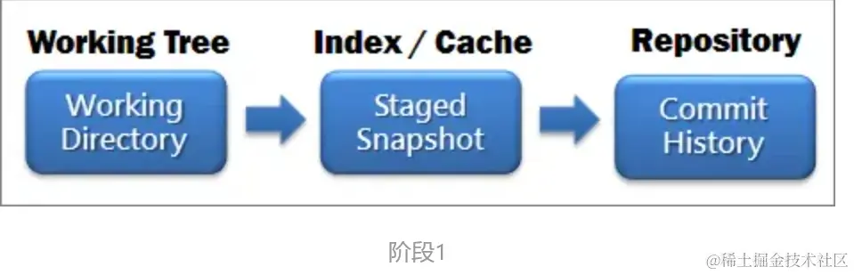 - Index/Stage 暂存区域,和git stash命令暂存的地方不一样。使用git add xx,就可以将xx添加近Stage里面