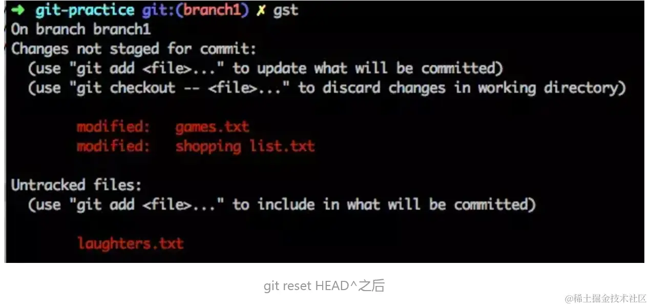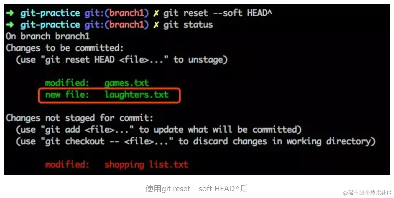 那么除了 HEAD 和它所指向的 branch1 被移动到 HEAD^ 之外,原先 HEAD 处 commit 的改动(也就是那个 laughters.txt 文件)也会被放进暂存区: