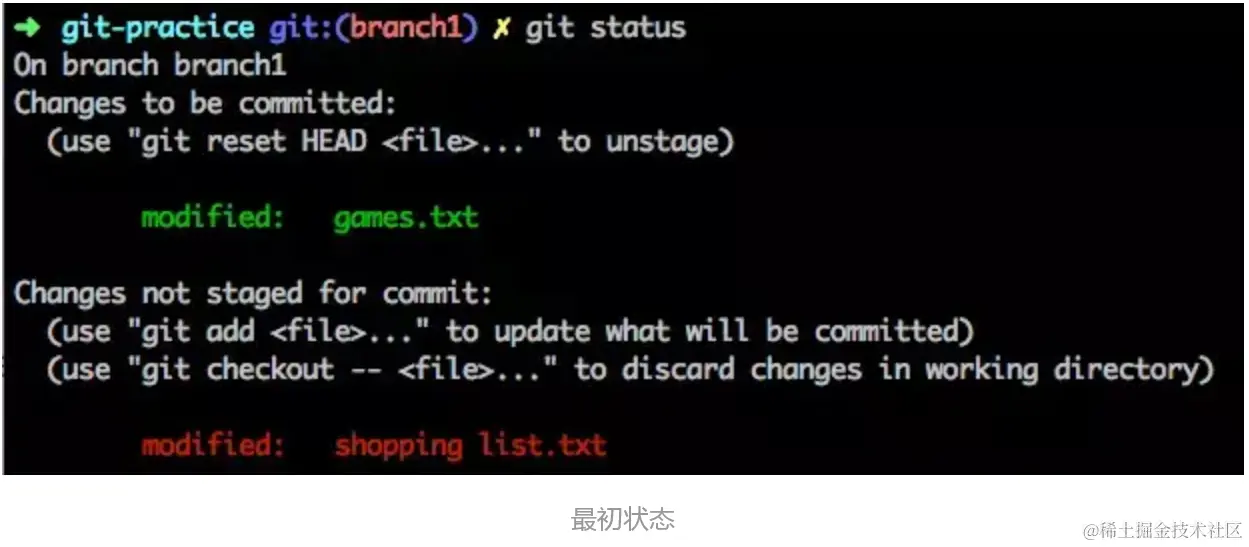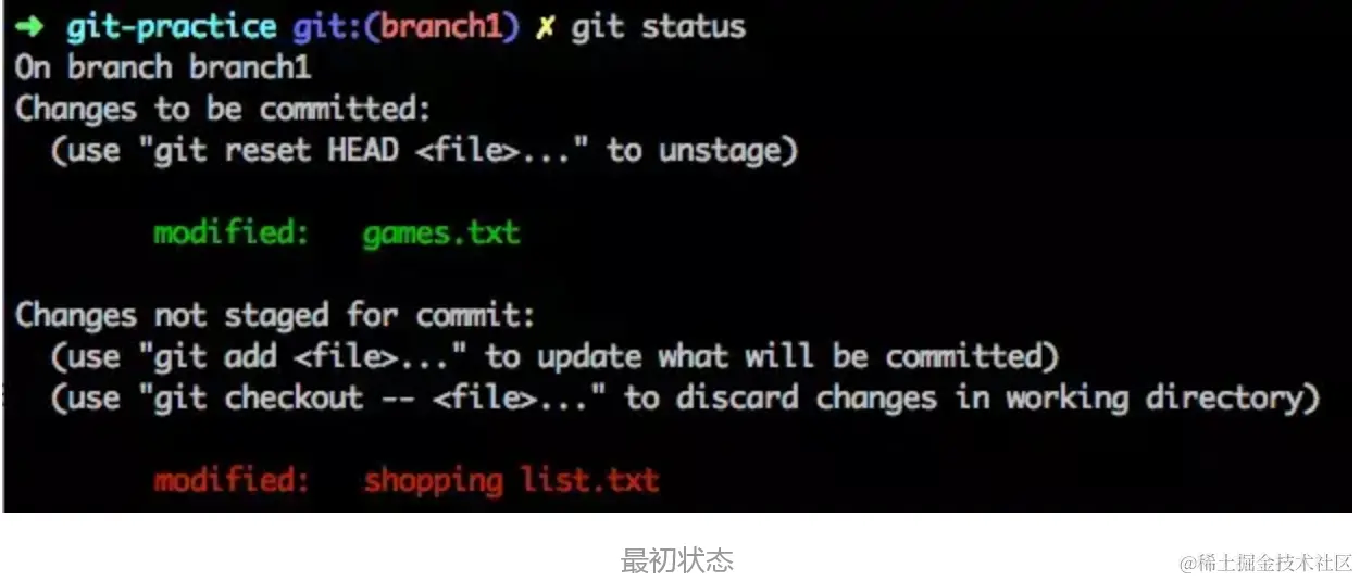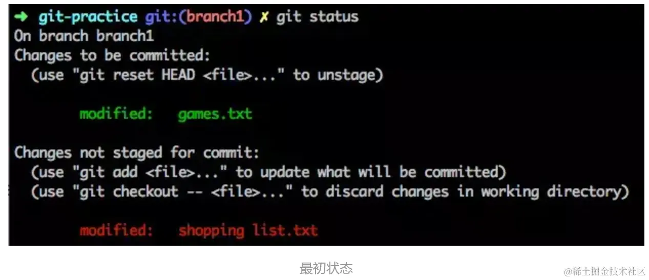 例如你在上次 commit 之后又对文件做了一些改动:把修改后的ganmes.txt文件add到stage区,修改后的shopping list.txt保留在工作目录