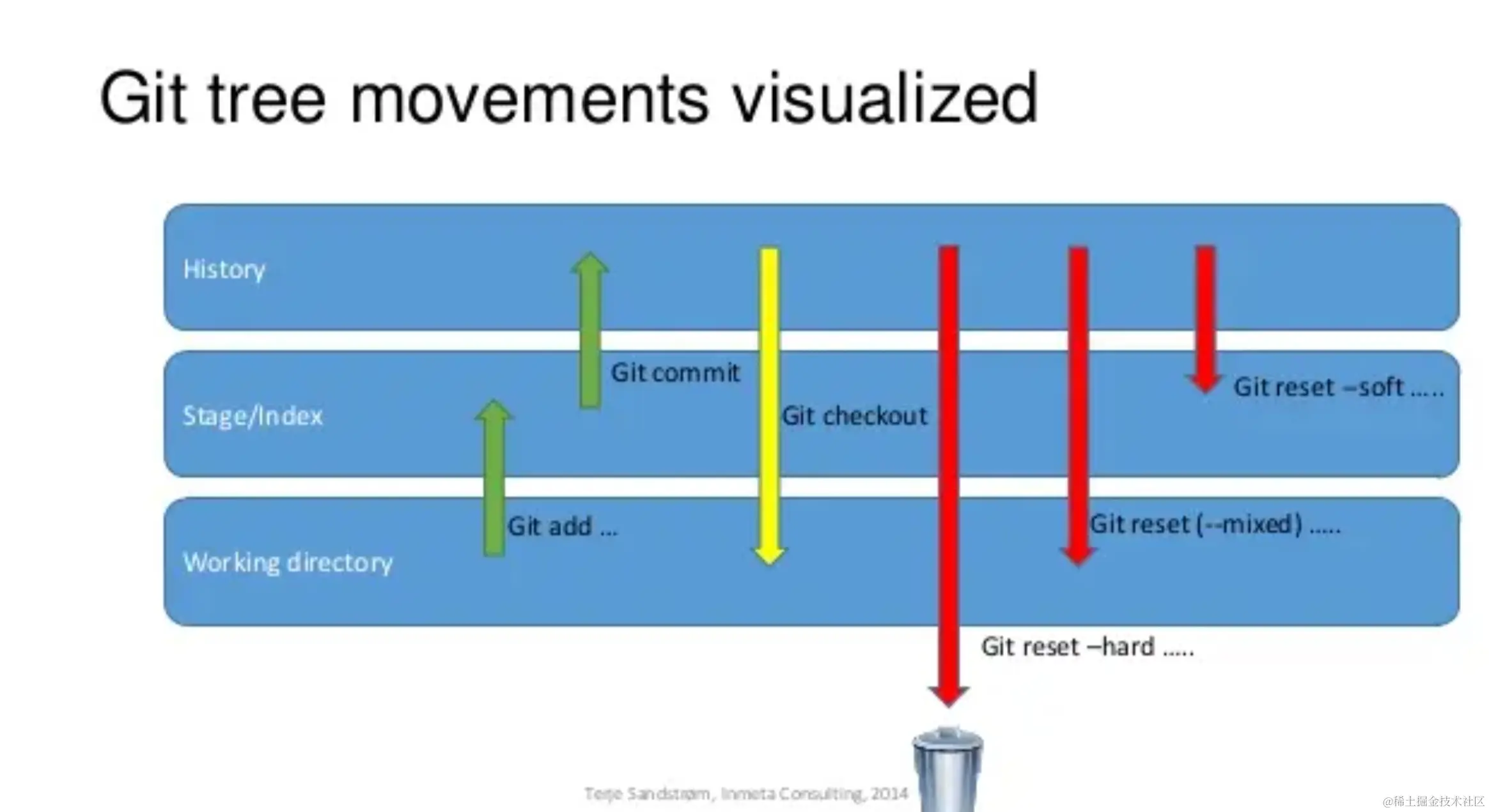 这三个模式理解了,对于使用这个命令很有帮助。在理解这三个模式之前,需要略微知道一点Git的基本流程。正如上图,Git会有三个区域: