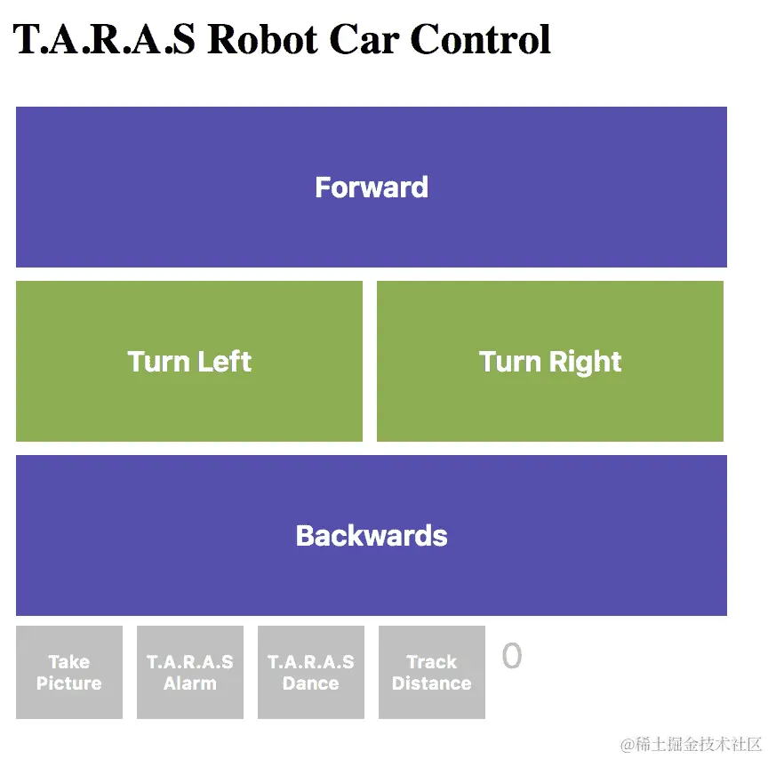 Take Picture按钮将拍照并将其存储在文件系统中,T.A.R.A.S Alarm将在 T.A.R.A.S 上触发警报,T.A.R.A.S Dance将使 T.A.R.A.S 跳舞。 -