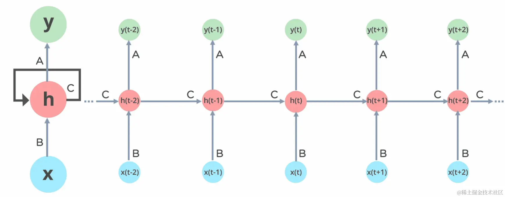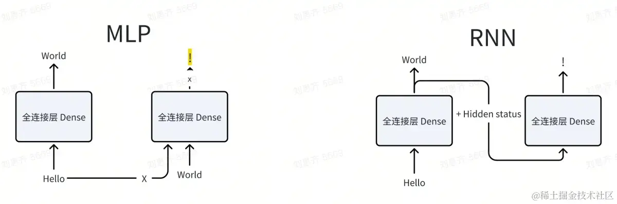 RNN 在 MLP 的基础上,加了一个通道,这个通道记录了之前所有的会话信息。