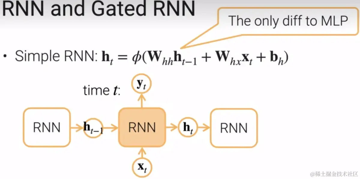 多了 Ht-1 和 Ht,上一时刻的 Ht-1 加激活函数 => Ht