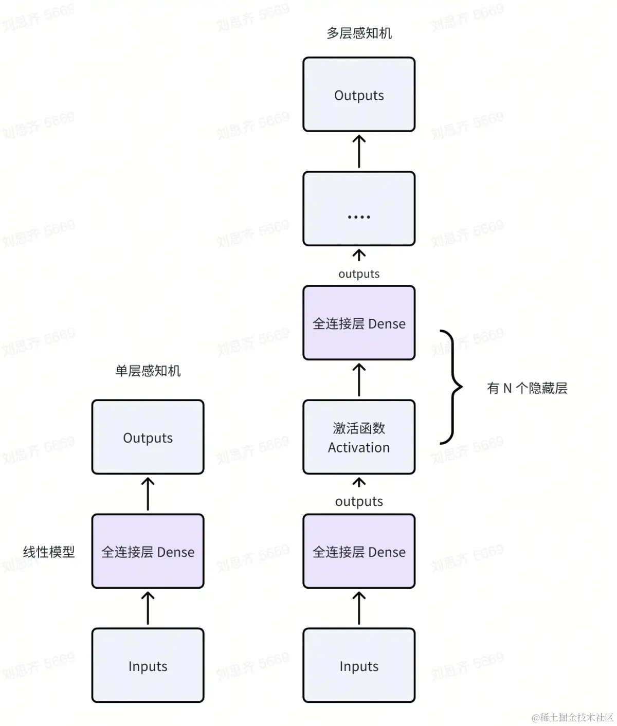 多个全连接层+激活函数就变成了多层感知机(非线性模型)。