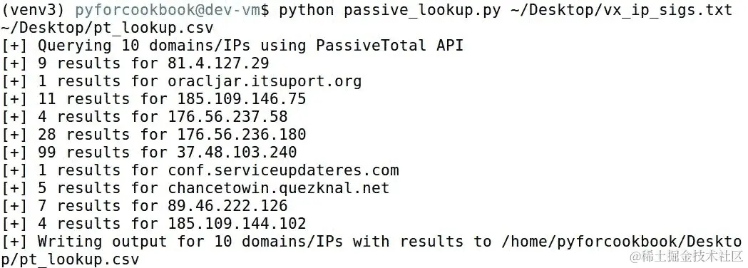 main() 函数非常简单,与之前的配方类似。我们再次使用集合来读取输入文件中的对象。这是为了避免对 PassiveTotal API 进行冗余的 API 调用,因为免费 API 有每日限制。在读取这些对象之后,我们调用query_domains()函数,该函数使用pt-client应用程序进行 API 调用。一旦我们从 API 调用中获得了所有返回的 JSON 数据,我们调用write_csv()方法将数据写入 CSV 文件。