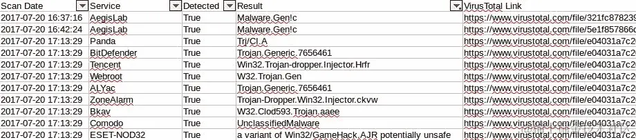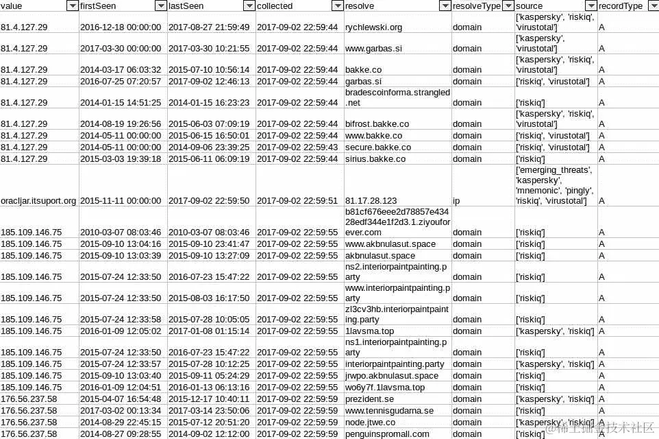 通过查看输出,我们可以了解文件和哈希的恶意软件分类,以及域名或 IP 在 CSV 格式中的排名: