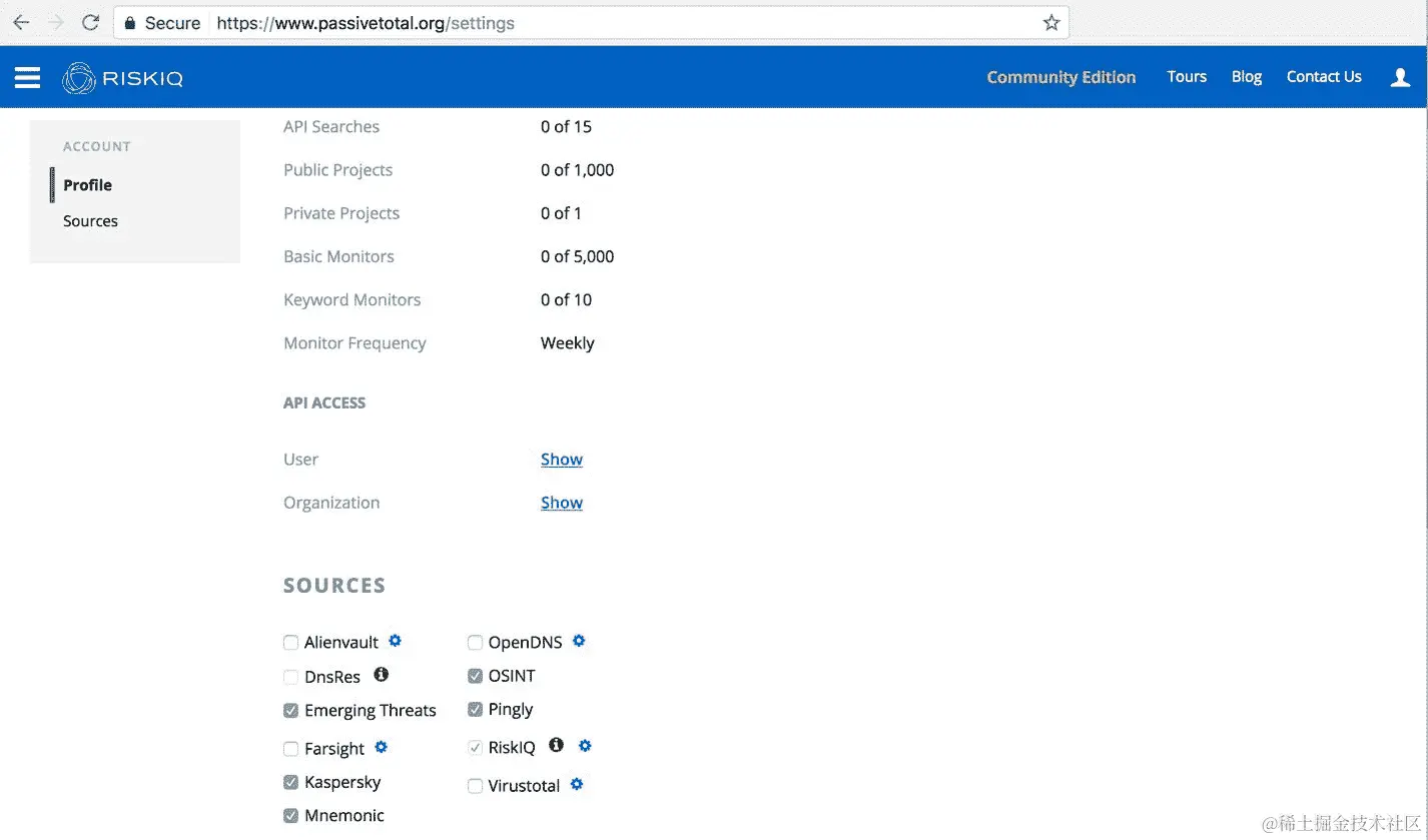 要使用 PassiveTotal API,您需要首先在他们的网站上创建一个免费帐户。登录后,您可以通过导航到帐户设置并在 API ACCESS 部分的用户显示按钮下点击查看 API 密钥。请参考以下截图以直观地了解此页面。